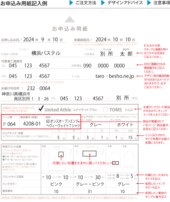 注意事項 ご注文方法 お申込み用紙記入例 デザインアドバイス